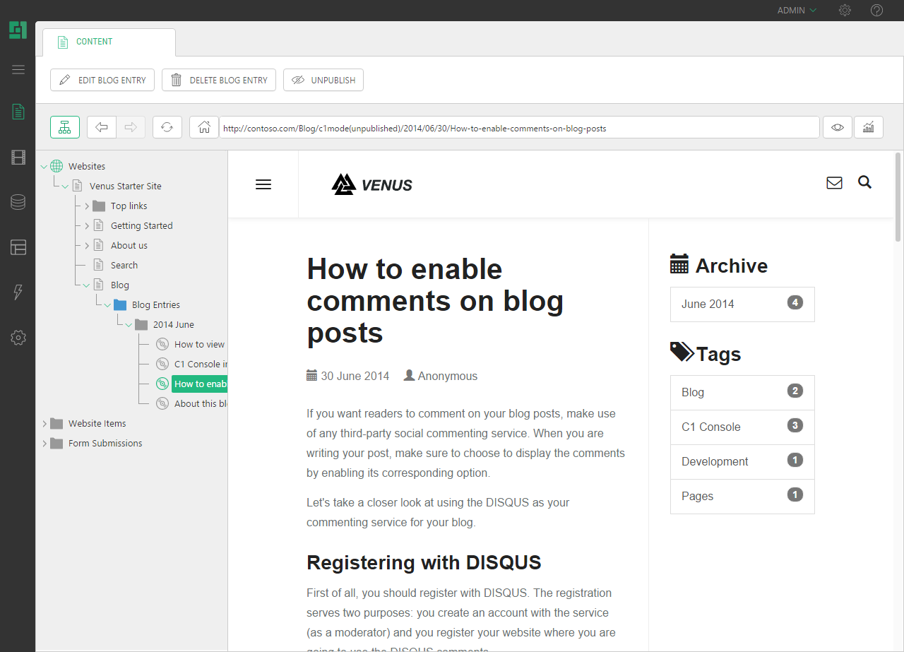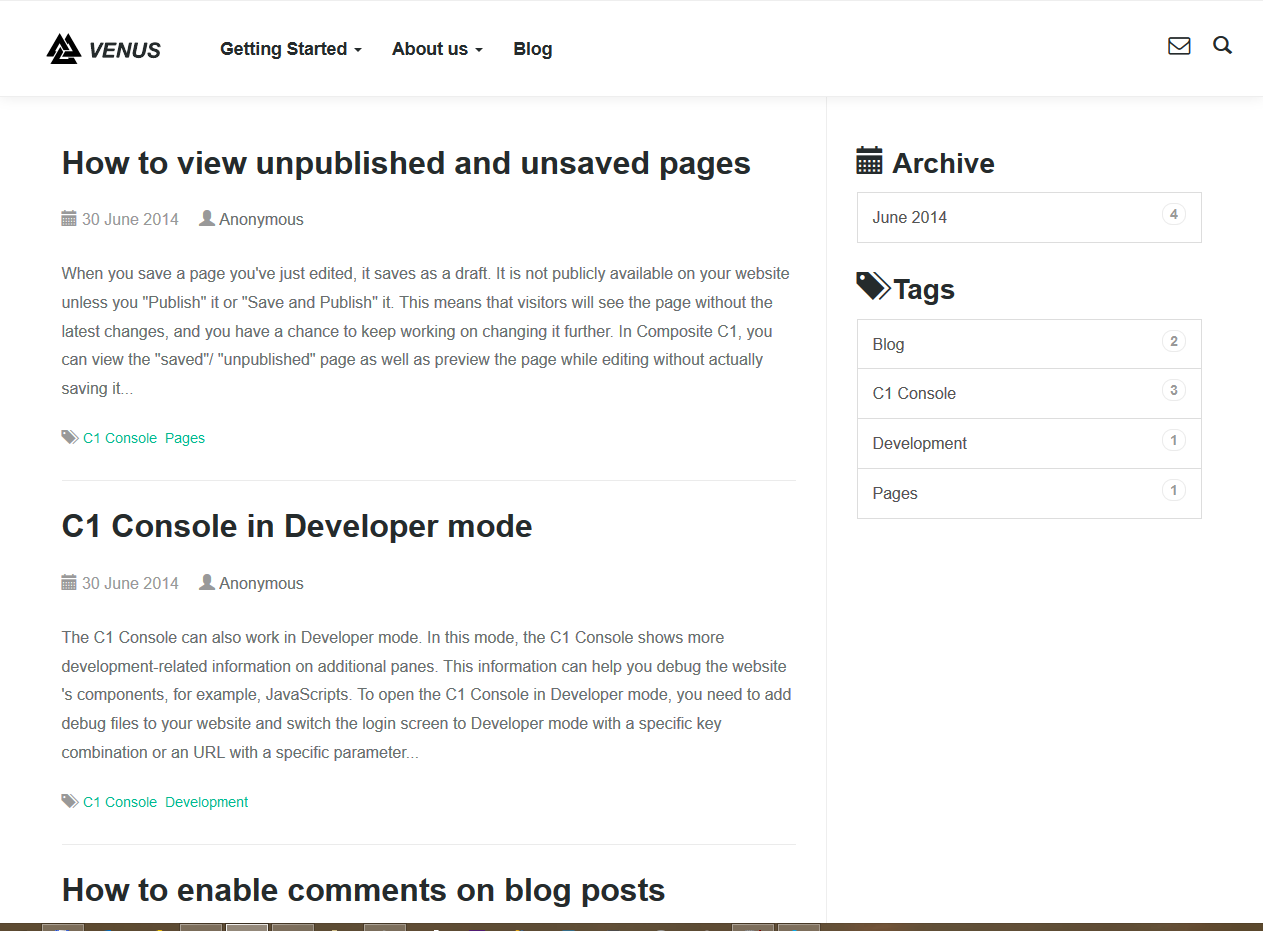 Blog entries are listed chronologically (latest to oldest). They can be filtered by month/year or tag, and the number of most recent posts displayed on a page can be adjusted.