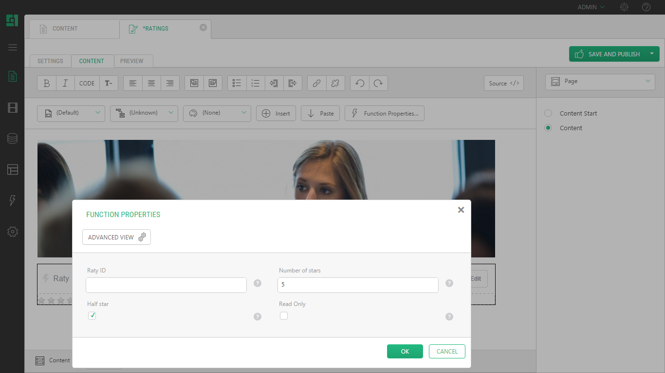 When adding the rating feature to pages or templates, you can specify how many stars must be shown and whether a half-star rating is allowed.