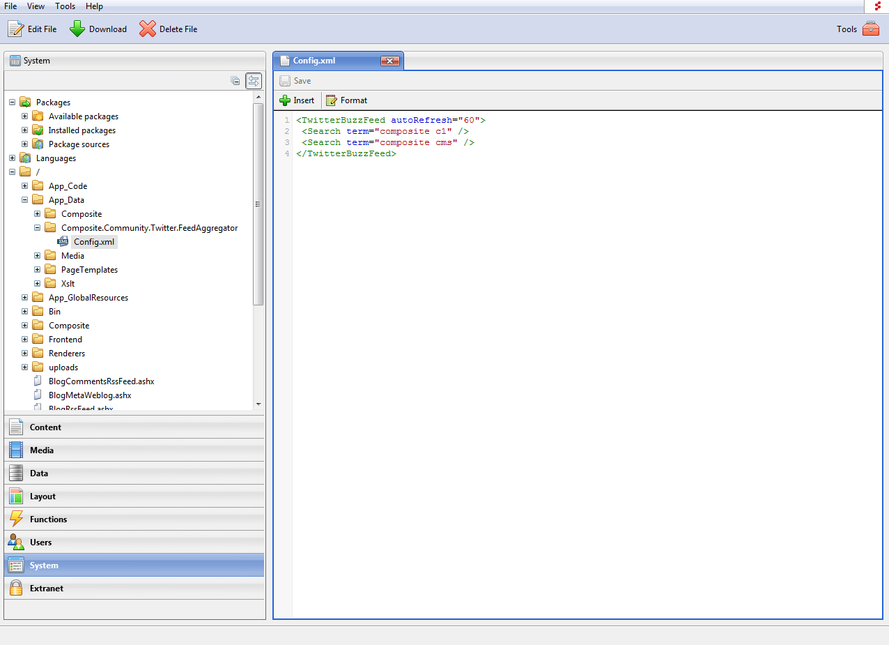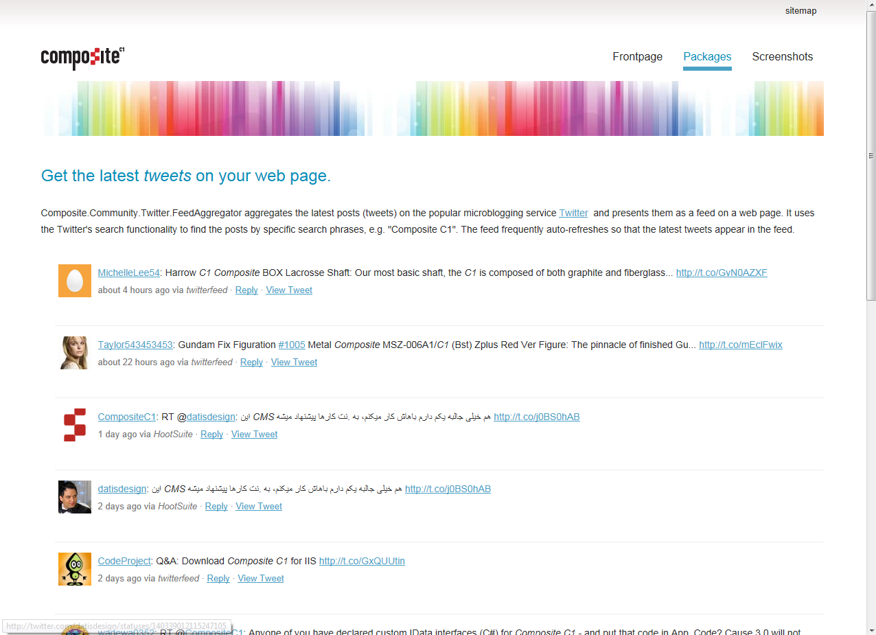 Composite.Community.Twitter.FeedAggregator aggregates the latest posts (tweets) on the popular microblogging service Twitter and presents them as a feed on a web page. It uses the Twitter's search functionality to find the posts by specific search phrases, e.g. "Orckestra CMS". The feed frequently auto-refreshes so that the latest tweets appear in the feed.