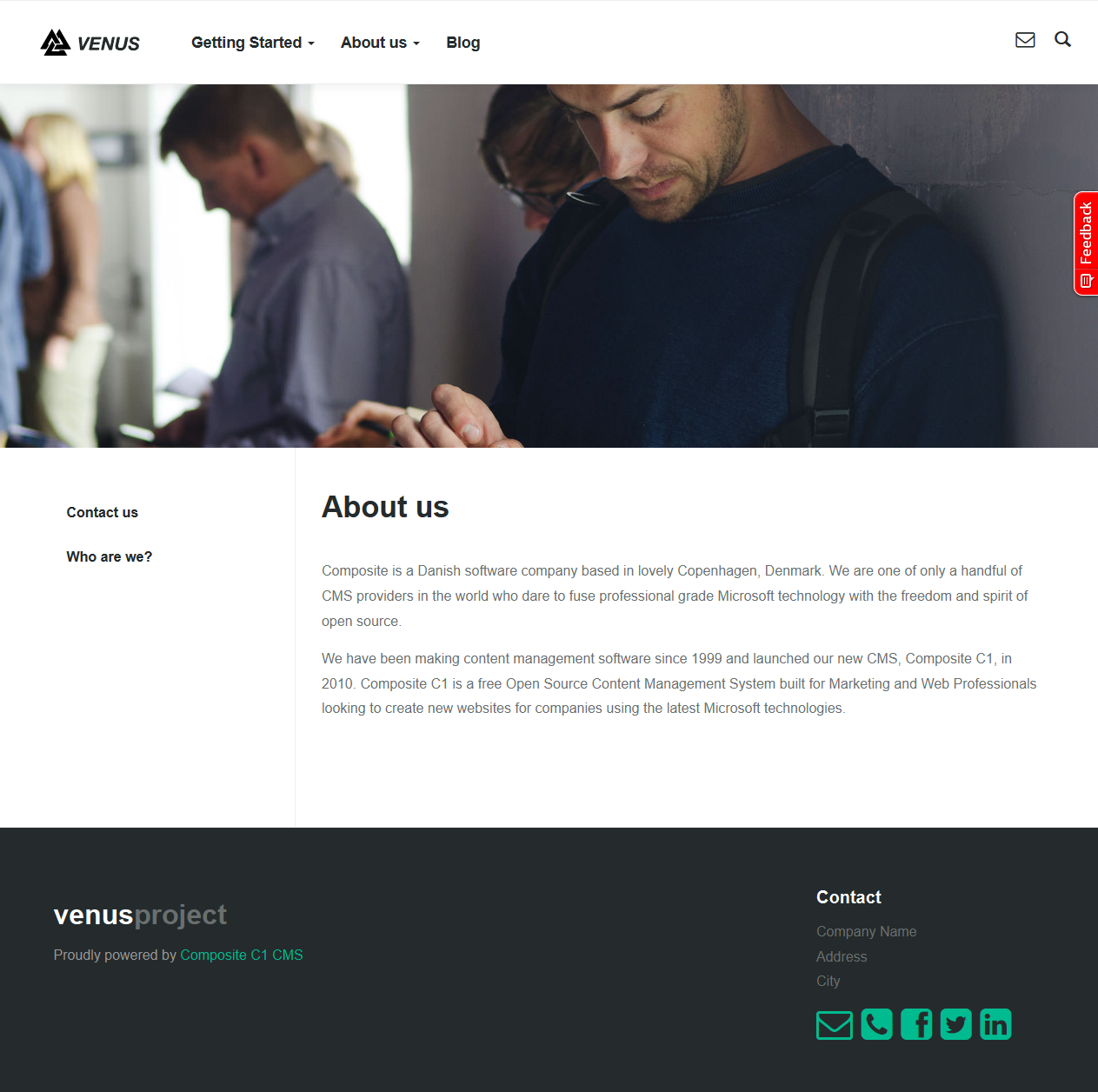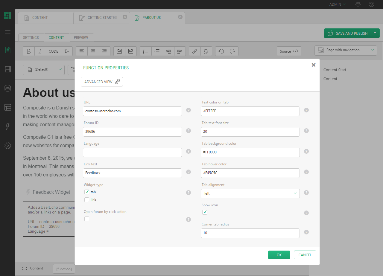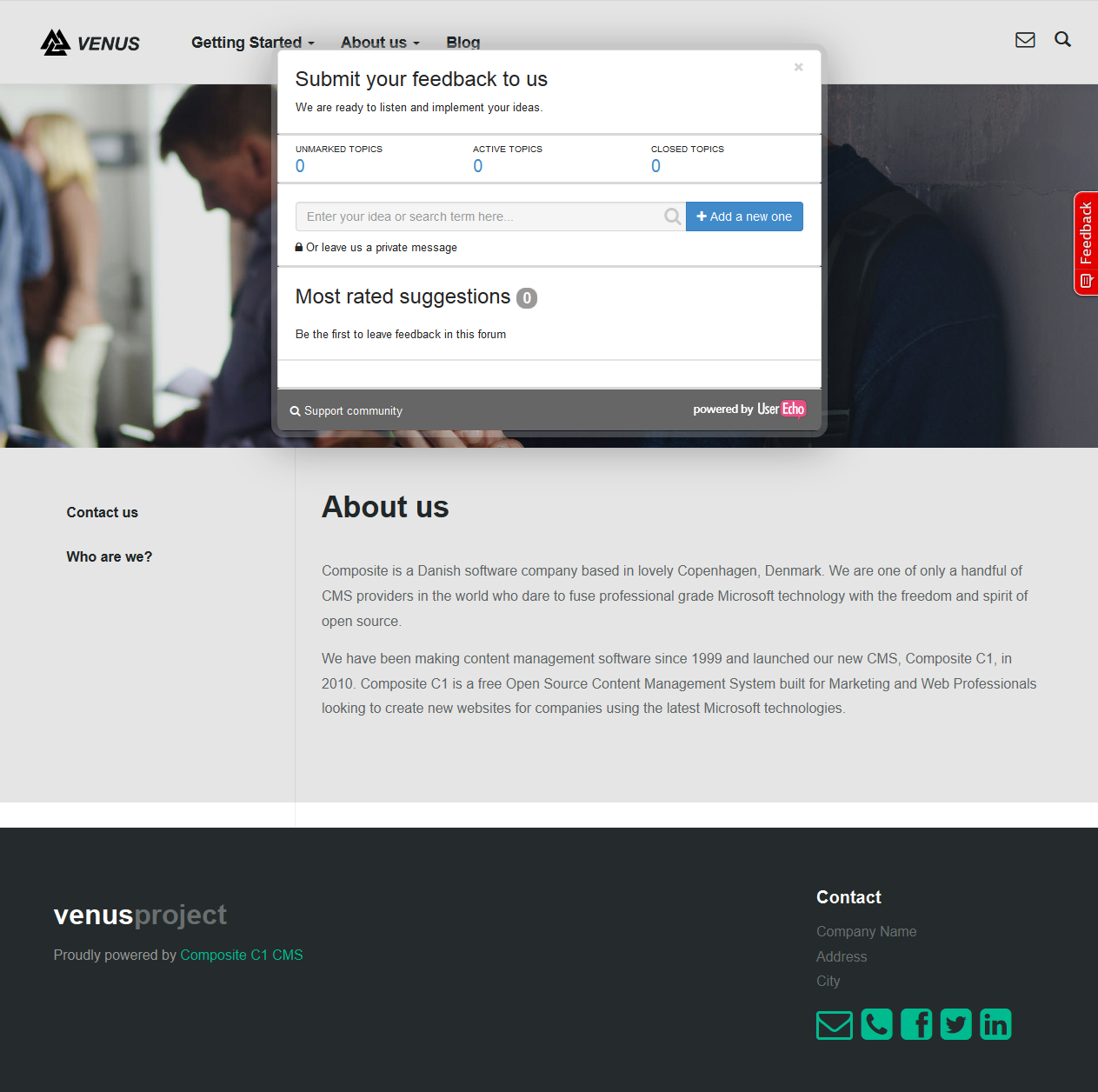 Composite.Community.UserEcho.FeedbackWidget allows you to add a UserEcho-based feedback widget (the side tab and/or link) to your website.