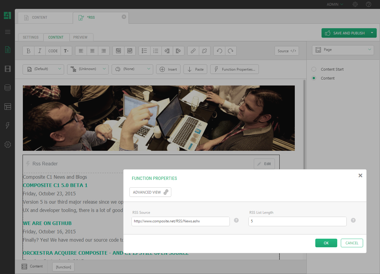 You can publish frequently updated news headlines or blog entries from other websites directly on a page by using the RSS Reader.