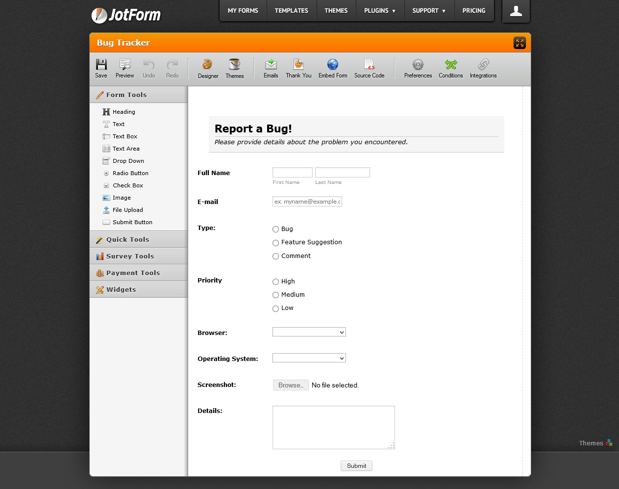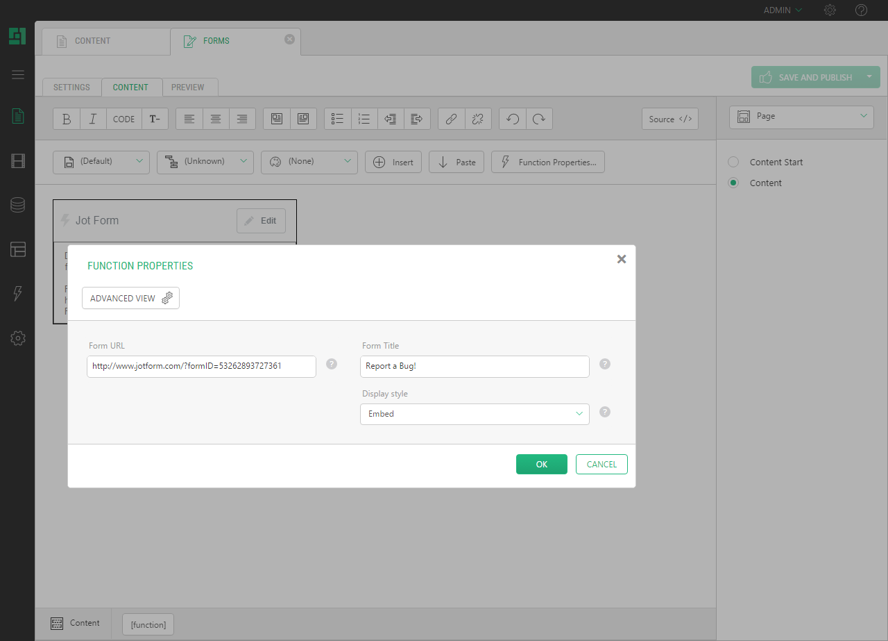Composite.Forms.JotForm displays forms you create by using JotForm, an online web form builder (http://www.jotform.com). You can choose how to display the form on your web page: embedded, in a iFrame, in a lightbox, in a popup window or via a feedback button.