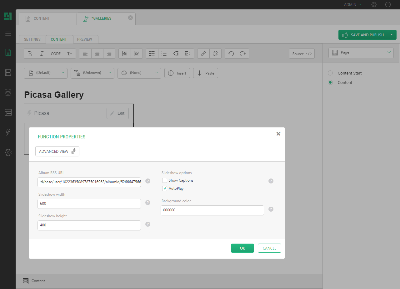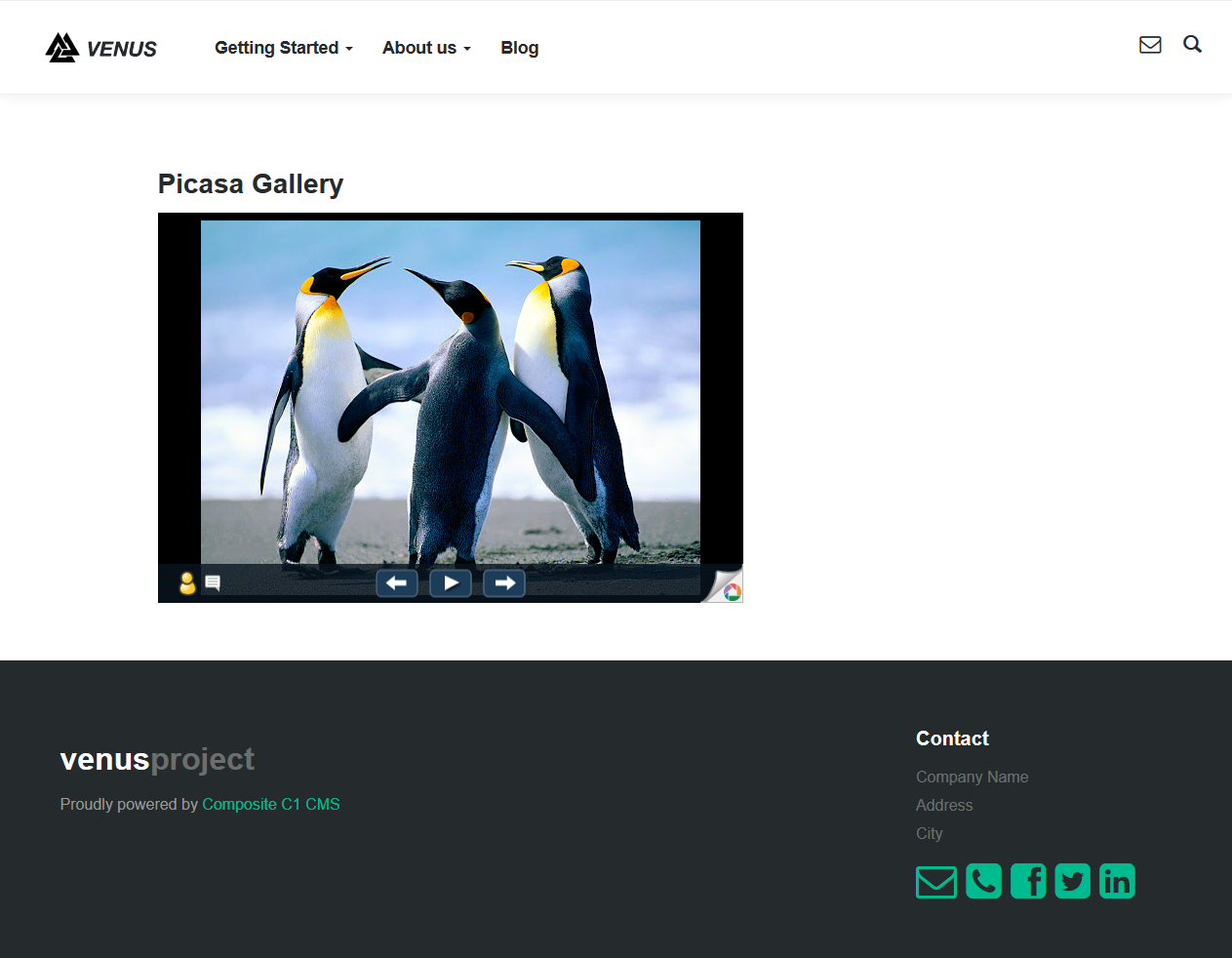 Composite.Media.ImageGallery.Picasa embeds a Flash slideshow of any web album available in Google Picasa Web on a page.