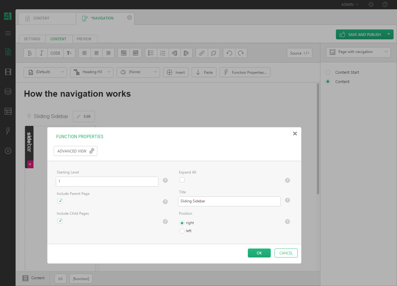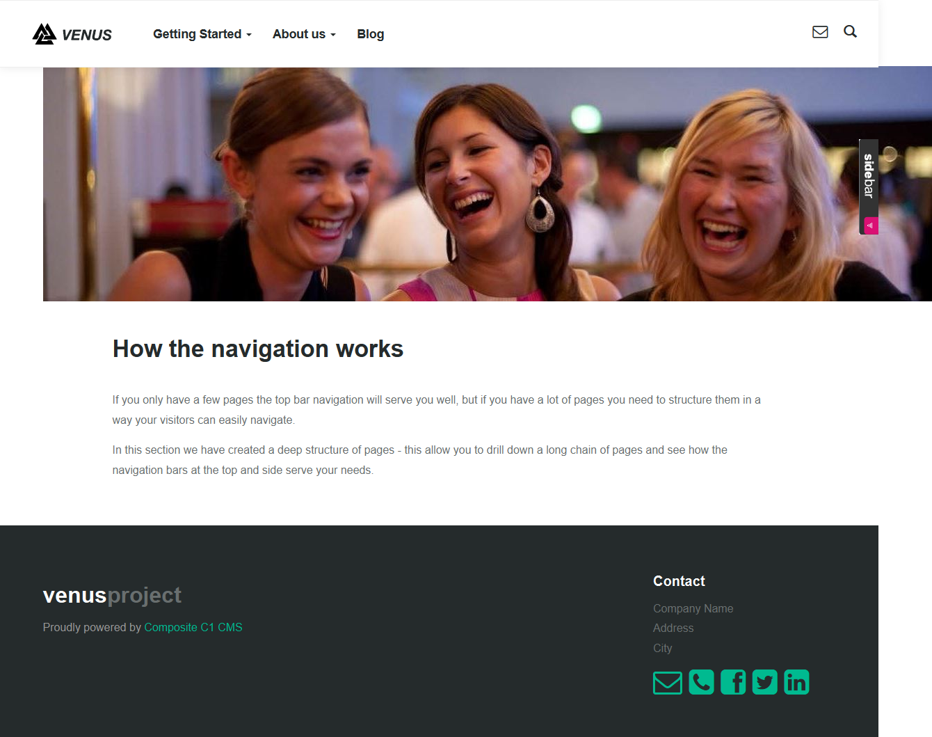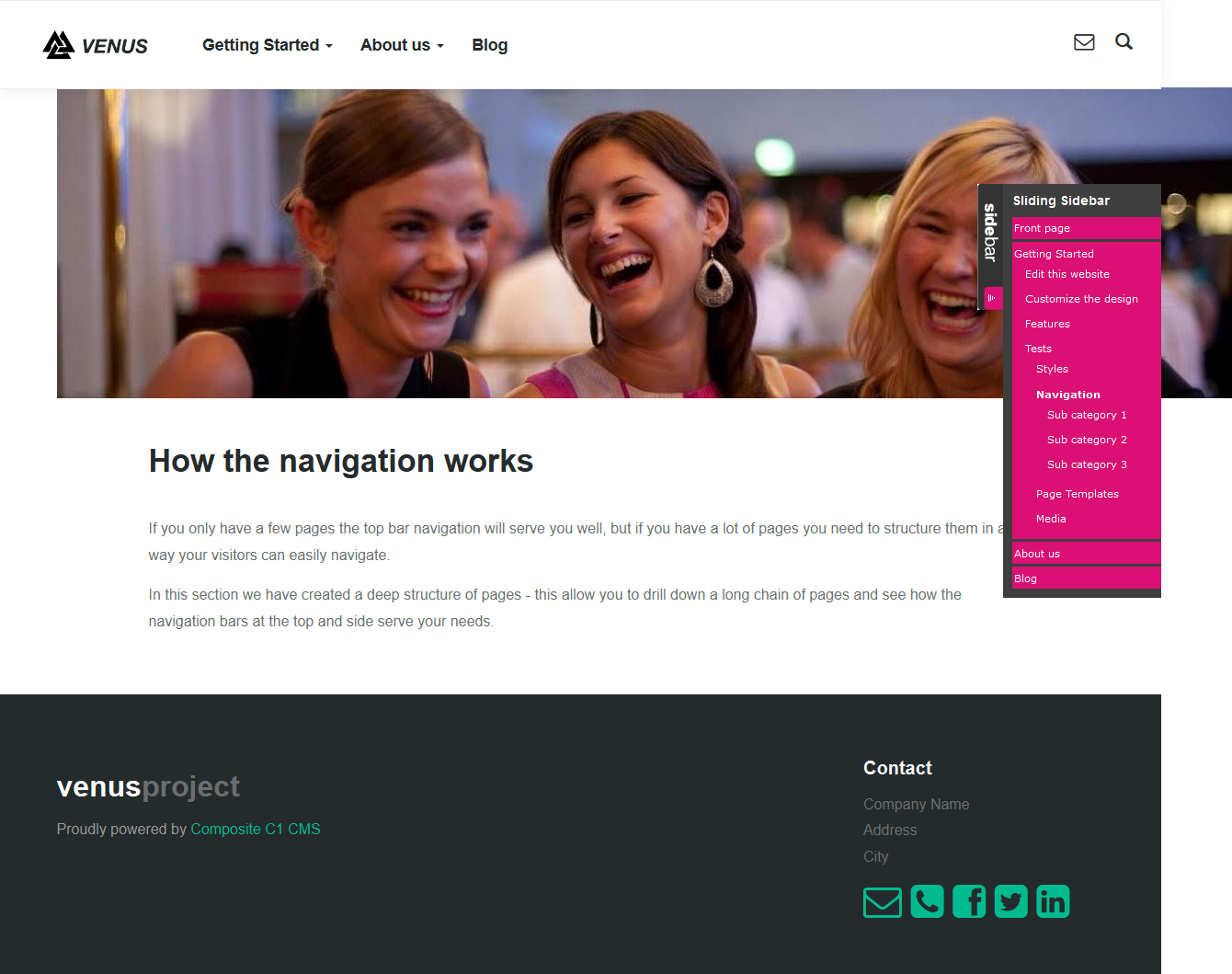 Composite.Navigation.SlidingSidebar provides you with the sliding sidebar navigation builder. The default behavior is a "sliding right column navigation tree", which allows users to navigate through all pages within the website, which have a navigation title.