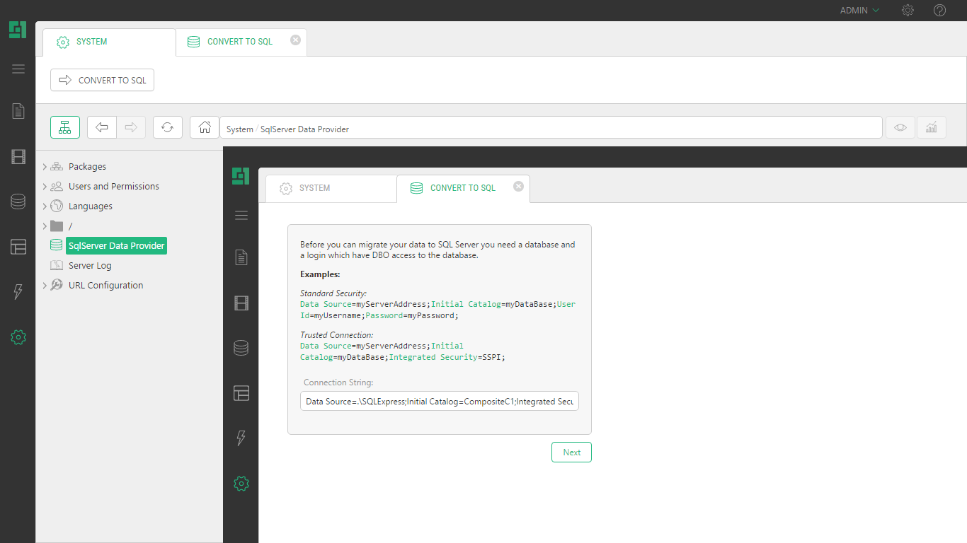 Composite.Tools.SqlServerDataProvider allows you to migrate your data store from flat XML files to an SQL Server database. The data store migration typically takes a few minutes after which the site is fully operational.