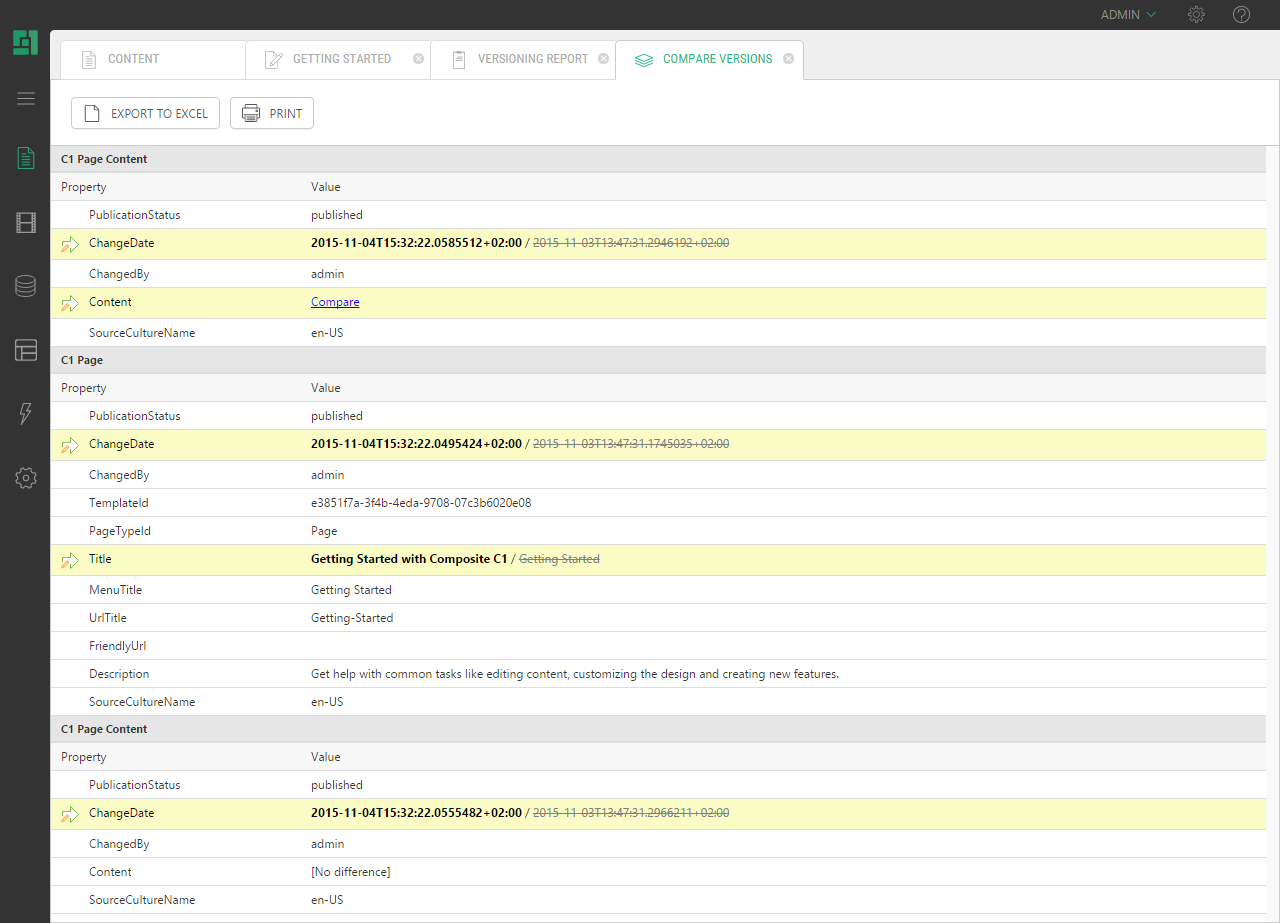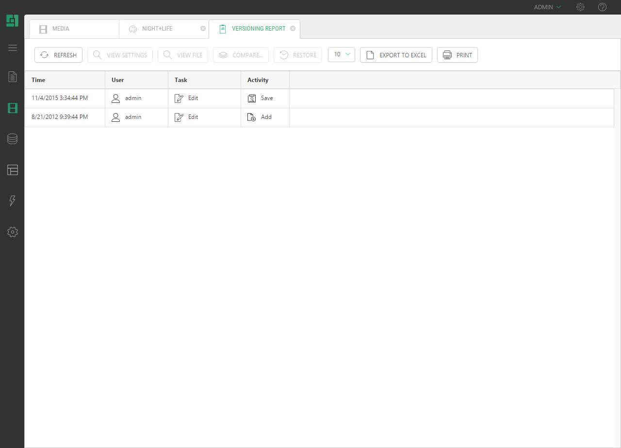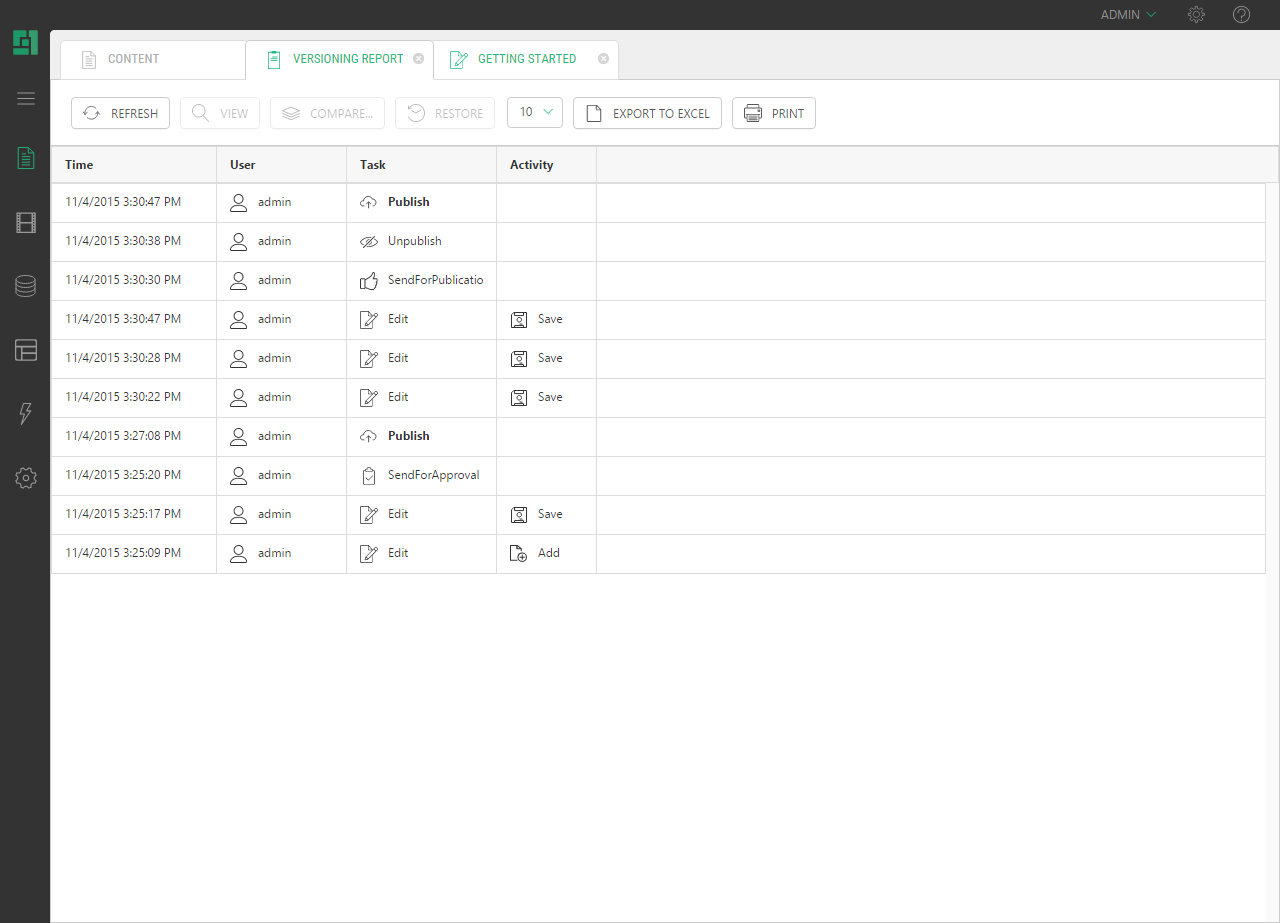 Also, you can invoke the versioning report from the context menu of a web page, data item or media file and get a full version history in a new view tab, listing changes in the selected web page, data item or media file, such as "Edit", "Publish", "Send to Approval" etc.