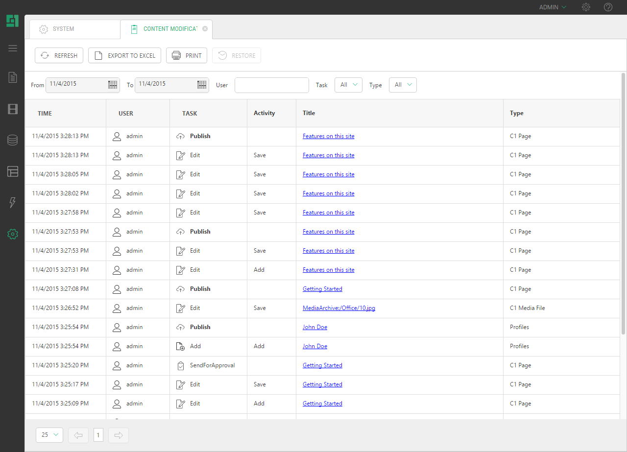 The Content Modification Log shows you all the changes made to content centrally. You can click the title in the log and get to the specific item and get a full versioning report. Here you can restore a deleted page, media file, global data or page data folder item.