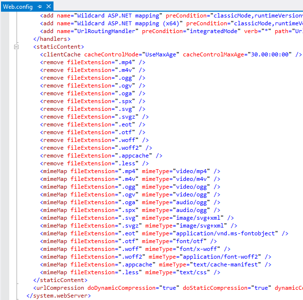 Composite.Web.Config.Html5MimeTypes adds support of HTML5 and CSS3 related file types such as mp4, webm or woff to your website by adding their MIME types to web.config.