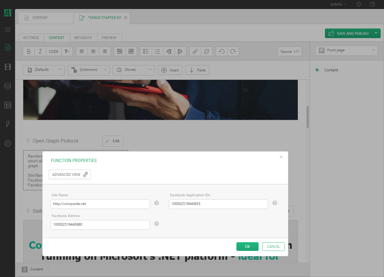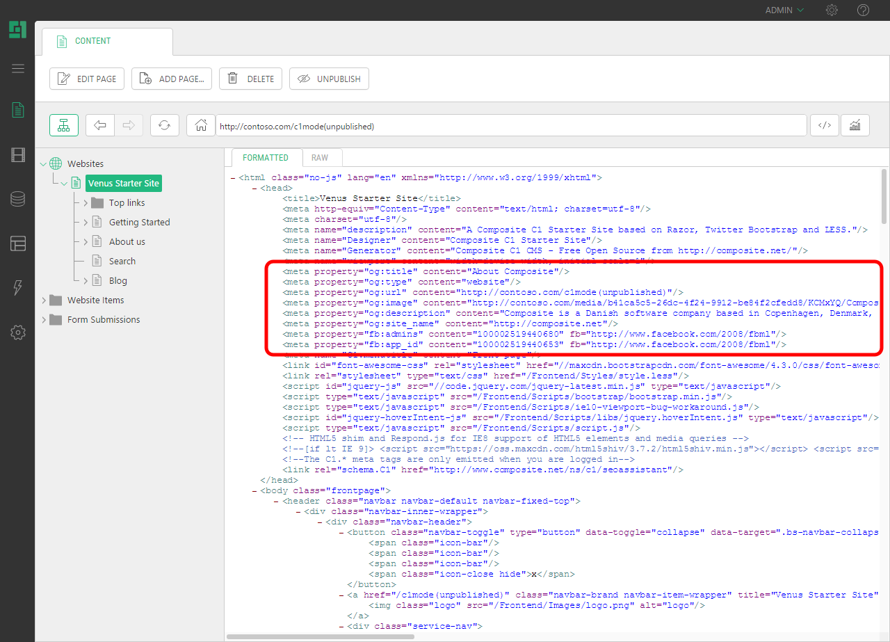 Composite.Web.Html.Meta.OpenGraphProtocol adds the Open Graph Protocol meta tags to a page, which allows its integration into the Facebook's social graph.