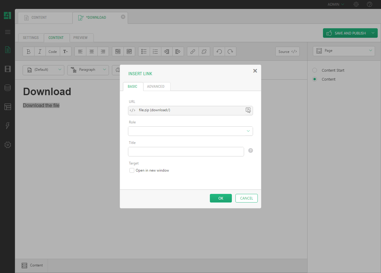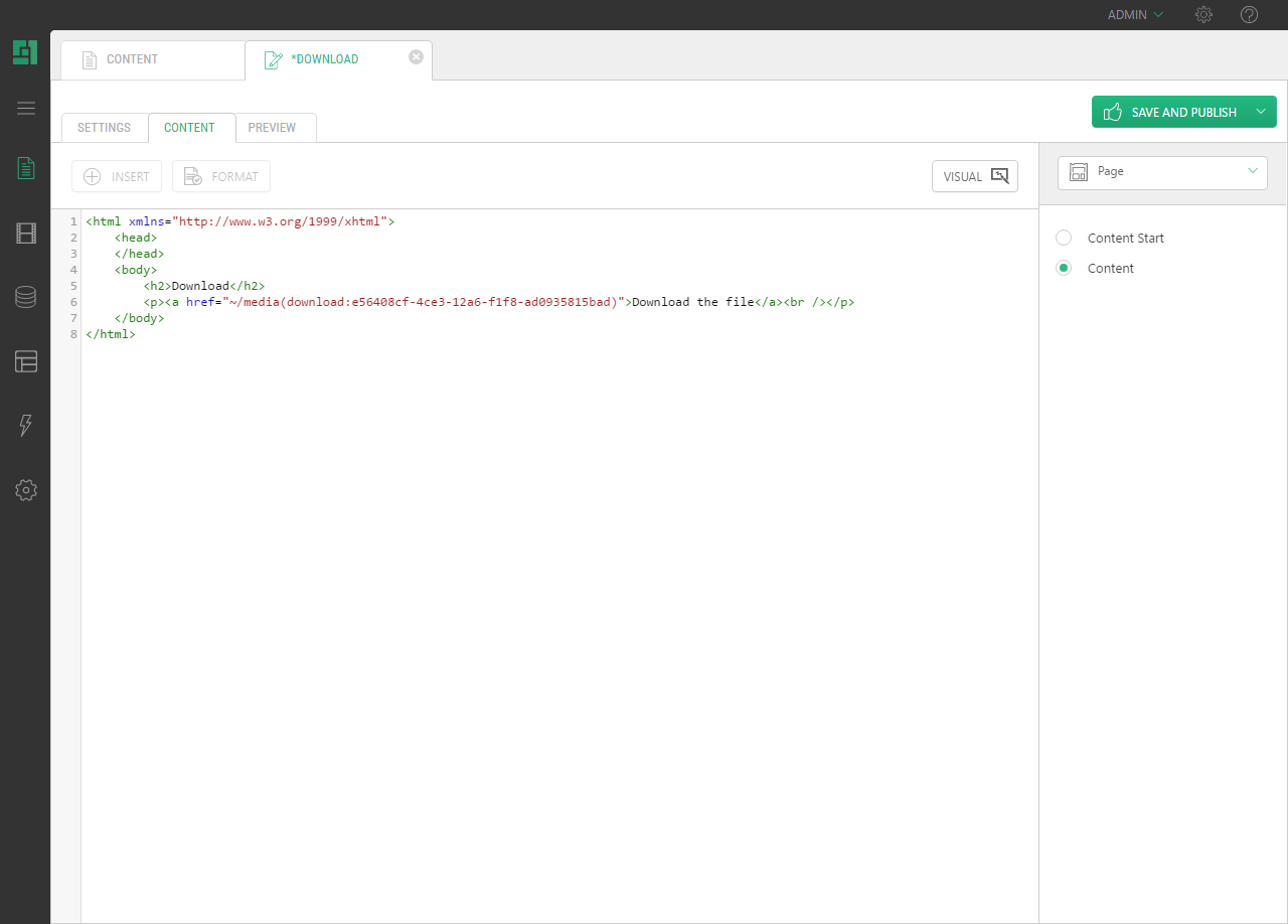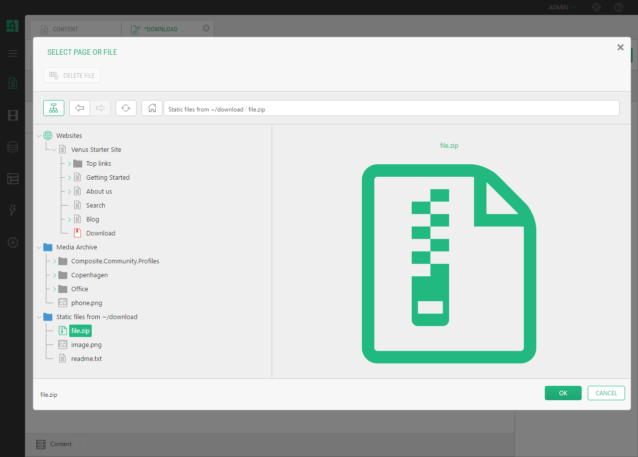 By default, this add-on creates a folder named "download" in the root of the website and exposes it as a media store in the Media perspective under the name of "Static files from ~/download".