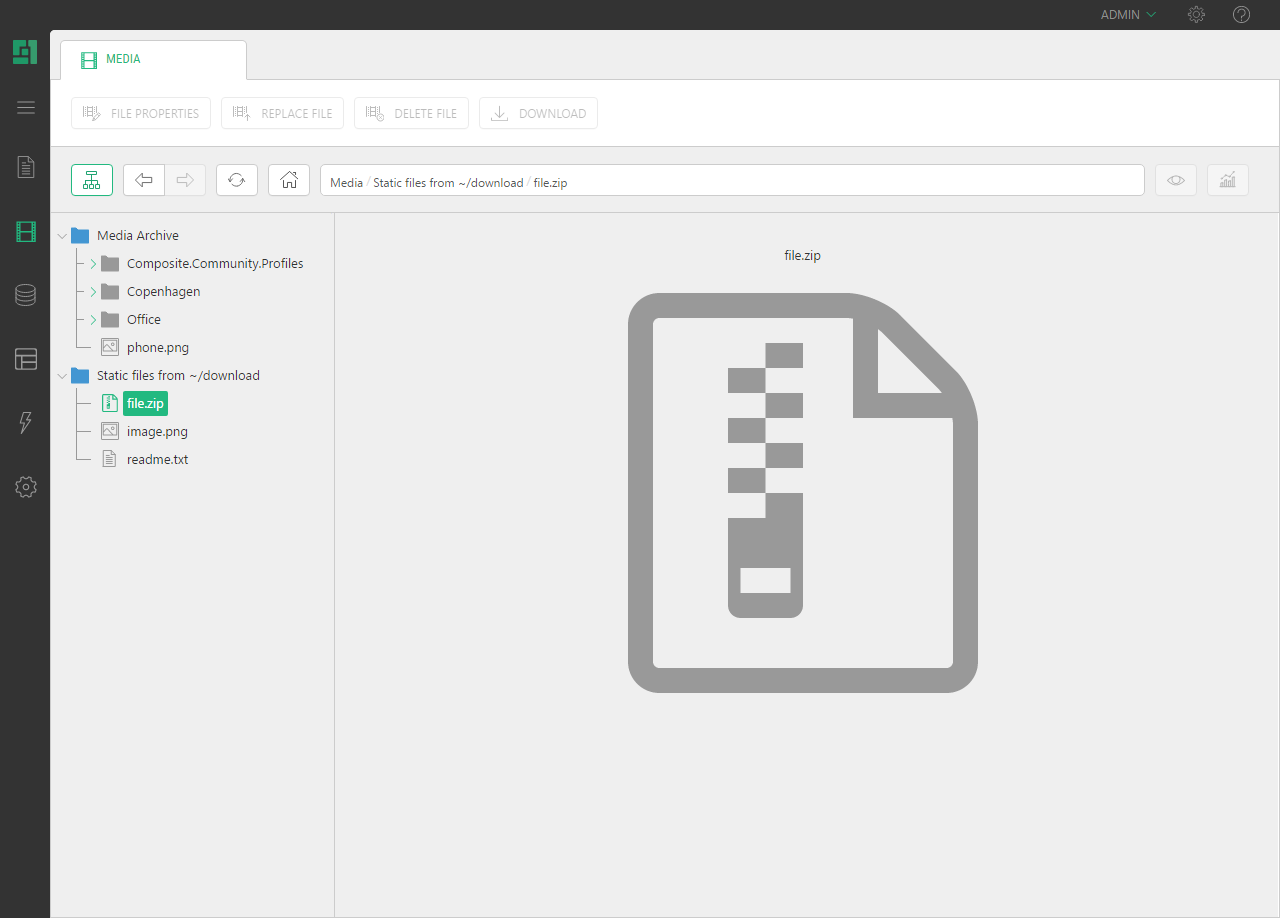 This add-on exposes website files in the Media perspective as a read-only media store and allows CMS Console users to link to them when editing content on pages etc.