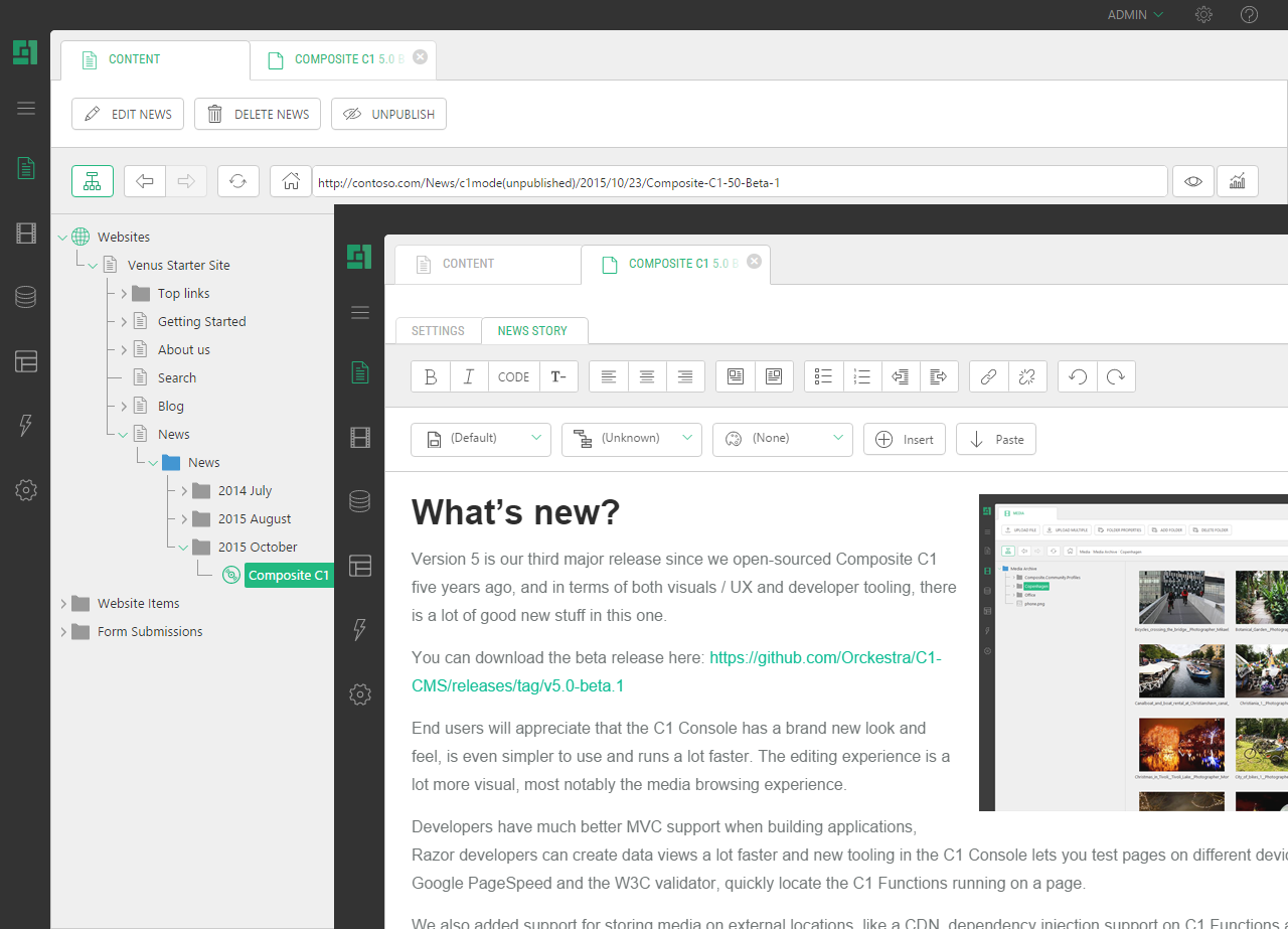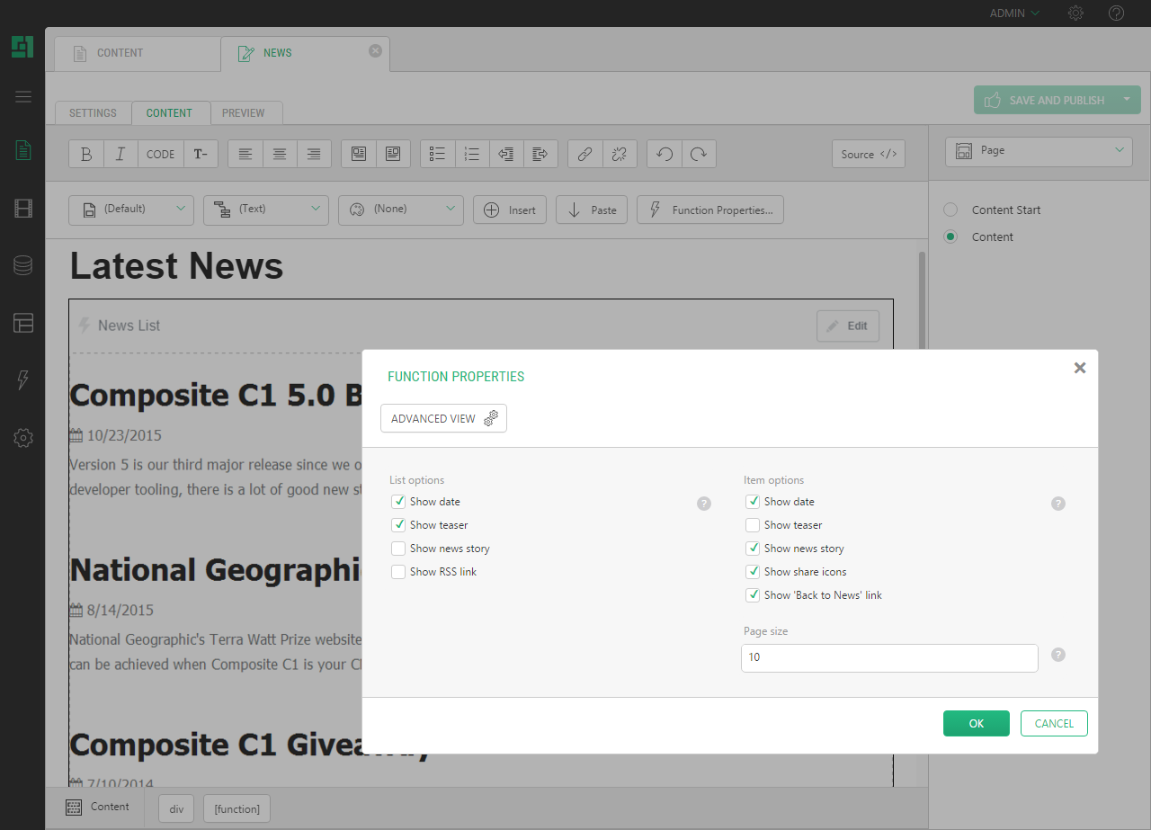 Orckestra.News adds news list to your website. It shows the latest news or news teasers on a web page. Clicking a news item shows the news content ("the full story"). You can choose how many news items to display on a page and how many news lists to have.