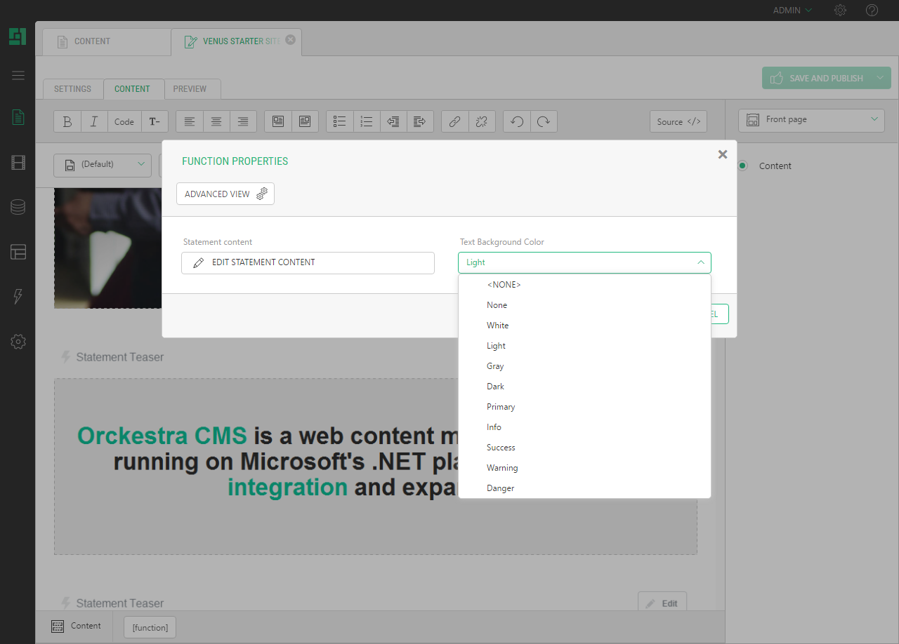 The Orckestra.Web.Html.ImageAndTextTeaser and Orckestra.Web.Html.StatementTeaser add-ons make use of this widget function to provide the user with style options for the background.